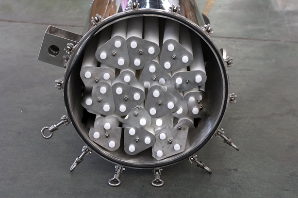 5.以設(shè)備中的拉桿為軸心,套入壓板,濾芯的上定位圈插入相對(duì)應(yīng)的壓板孔內(nèi),擰緊壓緊螺母;